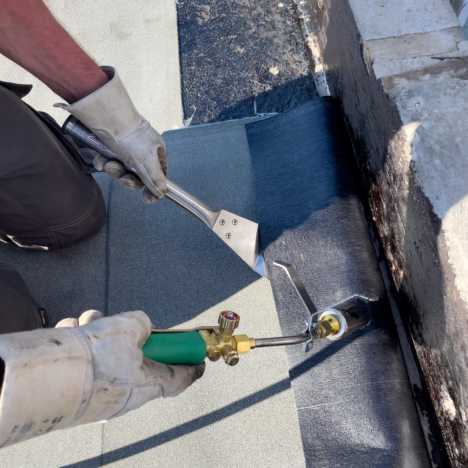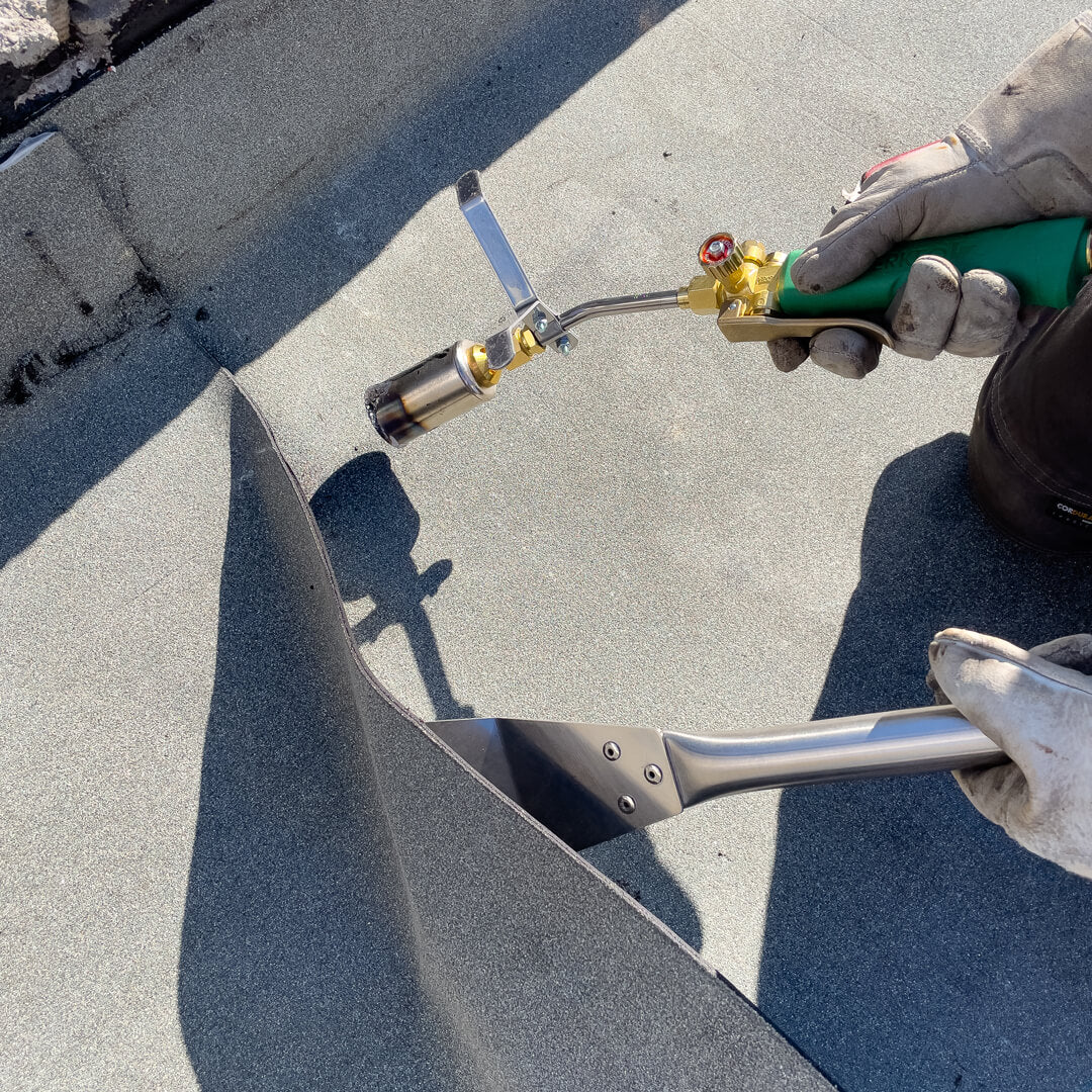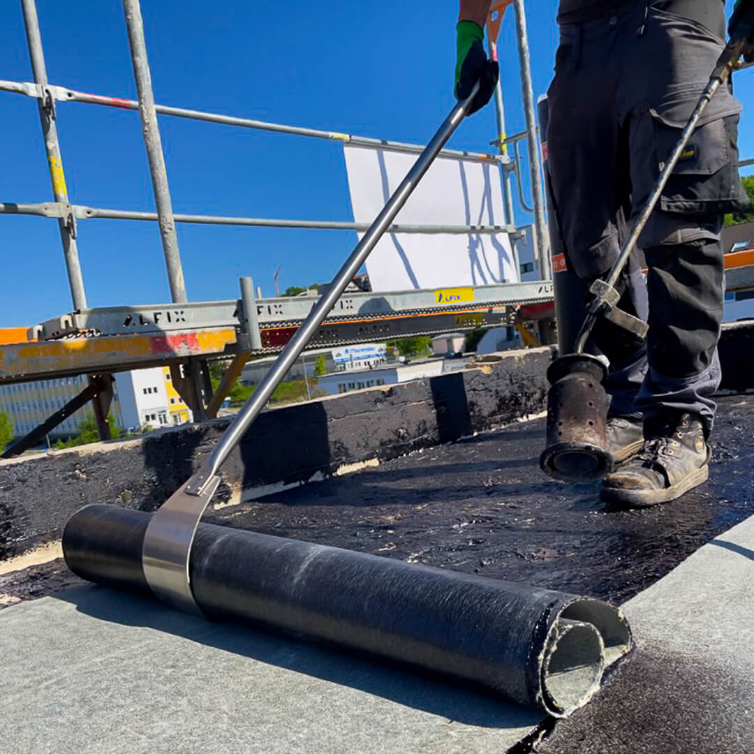 Endlich im Stehen Bitumenbahnen schweißen. Mit der Fachdachkelle ersparen Sie ihren Mitarbeitern unproduktives und unergonomisches Bücken beim bituminösen Schweißen.